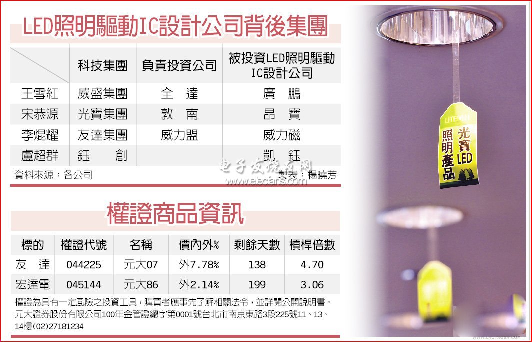 王雪红以老字号IC设计威盛集团切入,以旗下IC通路全达预计今年12月与LED照明驱动IC设计公司广鹏交换持股,全达将以7成持股正式入主广鹏,全达入主后预计将广鹏LED照明驱动IC向中国照明市场推进;同样是IC设计老板的卢超群所拥有的钰创、凯钰(5468)原本都是利基型IC设计公司,近几年各自进行产品多元化,凯钰转型切入LED照明驱动IC已有初步成果,预计今年第4季即可出货LED照明驱动IC。