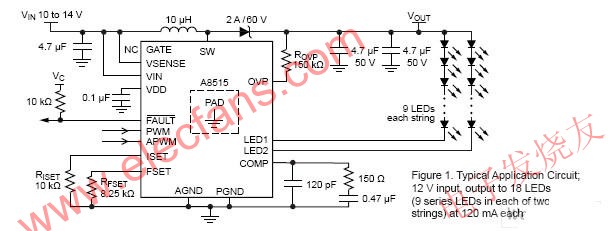 A8515 是一款多输出白光 LED (WLED) 驱动器,用于消费类和工业显示器中的 LCD 背光。它整合了电流模式升压转换器与内部电源开关和两个电流变换器。升压转换器可驱动多达 24 个 LED:12 个 LED 组成 1 串,电流为 120 mA。LED 交换器可并联,以达到更高的 LED 电流,最高达 240 mA。A8515 可采用 5 至 40 V的单电源工作。