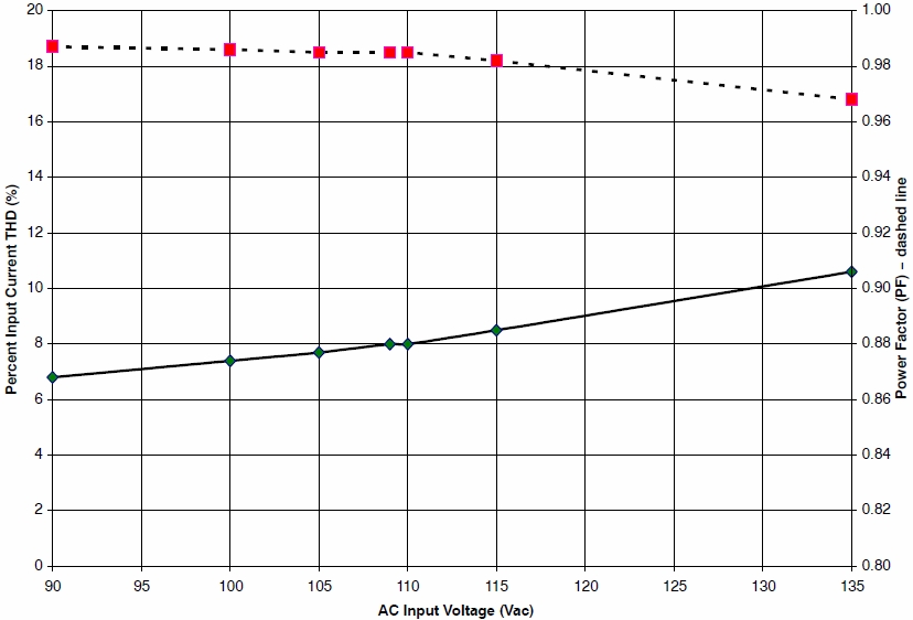 图2:90至135 Vac输入线路电压条件下的功率因数和总谐波失真