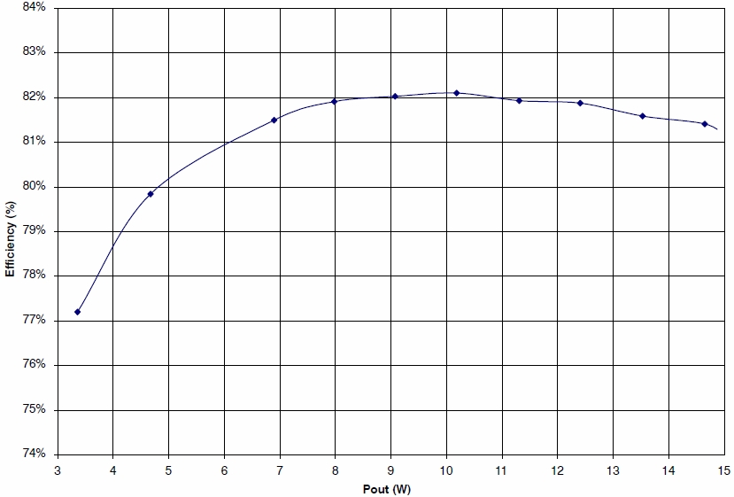 由于没有直接适用的LED驱动器能效标准,可考虑将“能源之星”2.0版外部电源(EPS)标准作为代用标准。根据EPS 2.0标准,额定功率在1到49 W之间的标准电源的最低能效要求为0.0626×ln(Pno)+0.622。因此,符合这标准的12 W额定功率电源的最低能效为77.7%,15 W电源则为79.1%。由于LED灯具标准基于输入插座能效,有必要将驱动器能效目标转换为有效的LED负载。为了增加一些设计裕量,我们将最低目标能效定为80%。这样一来,LED负载就为16.4 W×80%,即13.1 W。