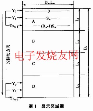需要显示的区域小于或等于实际显示区域时,采用静态显示即可。但大多时候需要显示的区域大于或等于实际显示区域,如图1所示。为了简化问题的分析,本文将显示区域高度设置为LED显示屏高度的4倍,宽度等于LED显示屏宽度。设显示屏的高度为Lh,宽度为Lw,则显示区域高度Dh=4Lh,宽度Dw=Lw。本文以单色显示作为描述对象,且Bw=Bn=8(Bw为扫描线条数,Bn为输出数据宽度),如图1所示。