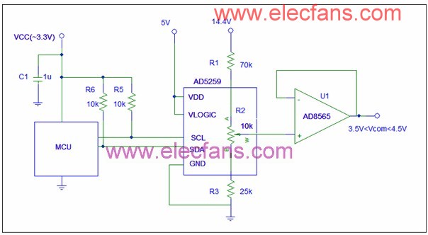 在没有提供5 V电源的系统中,很多设计工程师都会简单地试图从一排电阻串中的5 V处取出抽头。这是一个不可取的解决方案,因为在在写入EEPROM的编程期间,AD5259通常要吸收35 mA电流。由于R1压降过大,它不能吸收这么大的电流。为此,AD5259提供一个单独的VLOGIC引脚,该引脚能连接到任意逻辑电源上。这里使用数字电位器控制MCU的电源电压。现在,VLOGIC电源可以吸收35 mA可编程电流,VDD电源只吸收微安(μA)级电源电流用于为数字电位器内置电阻串的内置开关提供偏置电流。如果平板显示要求提高VCOM电压,可以增加加两个电阻器接到运算放大器的同相增益配置。
