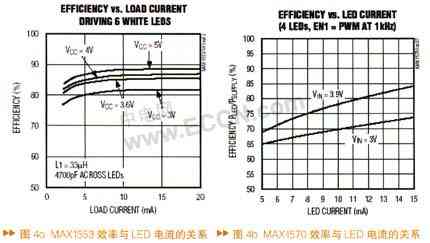 从图2和图3中,可以看出基于电感的LED驱动器与基于电容的电荷泵型LED驱动器相比,电路结构较为复杂;功率电感的选取对电路性能的影响较大,对很多设计人员来说是一个难点;此外电感体积也较大,比较占用电路板空间。基于电容的电荷泵型LED驱动器仅需少数几个电容,设计较为简单,节省了电路板空间。然而,基于电感的LED驱动器与电荷泵型LED驱动器相比,在效率方面有较明显的优势,MAX1553在LED工作电流范围以内基本可以保持80%左右的效率(见图4a),且效率随电流变化波动较小,而MAX1570电荷泵型LED驱动器的效率在LED的工作电流范围内有较大波动,且轻载时的效率将低于80%(见图4b)。