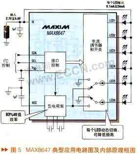 MAX8647能以恒定电流驱动6个白光LED或2组RBG LED,适合于显示屏背光或娱乐照明等应用。通过负电荷泵和自适应超低压差电流调节器,这些器件可在1节Li+电池的整个输入电压范围内、甚至在LED正向电压存在较大失配时仍然保持极高的效率。图5给出了MAX8647典型应用电路图及内部原理框图。