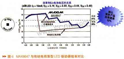 MAX8647这一新型负电荷泵消除了输入电源与LED之间的线路阻抗,器件所具有的自适应切换技术可对每个LED进行动态切换,对各路LED实现独立的供电、调光和稳流。当某路LED正向压降不够时,器件内部负电荷泵启动,将NEG的电压稳定到不超过VIN?5V的电压上,同时独立地将该路LED的电流回路从GND切换到NEG,而不是将全部LED的电流回路同时切换过来。例如,图5中的LED5和LED6,同样假设LED5的VF5 > VF6。当VIN较高时,负电荷泵关闭。随着能量的消耗,当VIN降低到LED5上的正向压降不足时,器件启动负电荷泵,LED5率先将LED的电流回路切换到NEG上,而LED6仍然保持原来状态,从而使整个LED驱动器的效率得到提高。这一独特的拓扑结果可显著提高电池寿命,使效率提高大约12%。图6显示了MAX8647与传统电荷泵型LED驱动器效率的对比关系。