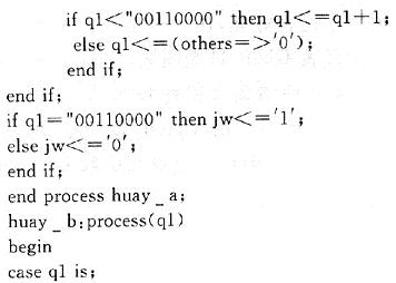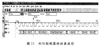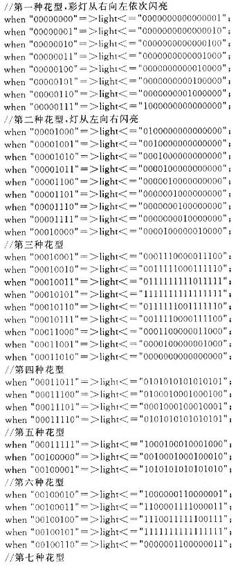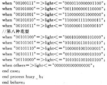 (3)彩灯控制器。彩灯控制器电路是整个设计的核心,它控制整个设计的输出效果也就是图案的样式变化。在电路中用1代表灯亮,用O代表灯灭,由0,1按不同的规律组合代表不同的灯光图案,同时使其选择不同的频率,以实现多种图案及多种频率的花样功能显示。该程序充分证明了用VHDL设计电路的灵活性,即可以通过改变程序中输出变量的位数来改变彩灯的数目。如图10,1l所示。