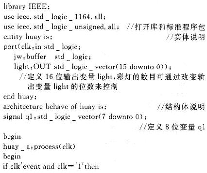 硬件描述语言(HDL)是相对于一般的计算机软件语言如C,Pascal而言的。HDL是用于设计硬件电子系统的计算机语言,它描述电子系统的逻辑功能、电路结构和连接方式。设计者可以利用HDL程序来描述所希望的电路系统,规定其结构特征和电路的行为方式,然后利用综合器和适配器将此程序变成能控制FPGA和CPLD内部结构,并实现相应逻辑功能的门级或更底层的结构网表文件和下载文件。VHDL(VeryHigh Speed Integrated Circuit Hardware descriptionLangtuage)主要用于描述数字系统的结构、行为、功能和接口。与其他的HDL语言相比,VHDL具有更强的行为描述能力,从而决定了它成为系统设计领域最佳的硬件描述语言。强大的行为描述能力是避开具体的器件结构。从逻辑行为上描述和设计大规模电子系统的重要保证。在文献中作者从不同的角度阐述了EDA技术的应用,它具有功能强大、描述能力强、可移植性好、研制周期短、成本低等特点,即使设计者不懂硬件的结构,也能进行独立的设计。本文以Alter公司提供的Max+PlusⅡ为平台,设计一个可变速的彩灯控制器,可以在不修改硬件电路的基础上,仅通过更改软件就能实现任意修改花型的编程控制方案,实现控制16只LED以8种花型和4种速度循环变化显示,而且设计非常方便,设计的电路保密性强。