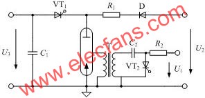 预燃电源由脉冲氙灯的高压触发和预燃电流维持两部分组成,如图1所示。传统预燃电路的U1 和U2 通常通过工频升压变压器升压和二极管整流得到,这种电路主要存在以下缺点:工频升压变压器体积大、笨重;限流电阻R1上消耗的功率较多,一般在100W~300W之间;必须有高压触发电路;输出脉冲氙灯的预燃电流不可调[5]。