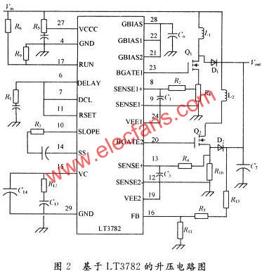 LT3782是美国凌力尔特公司生产的两相步进升压型DC/DC控制器,28引脚SSOP封装芯片,开关频率在150~500 kHz之间可编程,由于采用两相BOOST拓扑结构。对输出场效应管漏电流和肖特基二极管通过电流的要求都减少一半,即两个输出相位差180°,两个输出间互相抑制输出纹波电流,输出纹波是单相BOOST转换电路的1/3。电源效率高,对散热的要求小。图1是LT3782的管脚图,第29引脚是芯片底部的散热脚。27引脚连接输入电源;4引脚接地;11引脚用来设定开关频率;20和23BGATE引脚用来驱动场效应管的栅极;8,9,1 2和13SENSE引脚用来反馈场效应管的输出电流;16引脚是输出电压反馈引脚,该脚电压为2.44 V,通过反馈电阻可以设定输出电压值。17引脚是低电压关断引脚,当该引脚的电压大于2.45 V时,器件才开始工作,当该引脚的电压小于0.3 V时,器件进入低电压关断模式。14引脚是软启动引脚,当加电时,输出电压从0 V渐变到设定的输出电压值,典型的启动时间可以由下式计算: