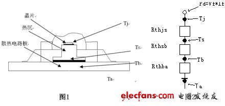(2)设定晶片上P-N结点生成的热沿着以下简化的热路径传导:结点→热沉→铝基散热电路板→空气/环境(见图1),则热路径的简化模型就是串联热阻回路,如图2表示: