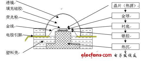如何降低大功率LED的热阻、结温,使PN结产生的热量能尽快的散发出去,不仅可提高产品的发光效率,提高产品的饱和电流,同时也提高了产品的可靠性和寿命。据有关资料分析,大约70%的故障来自LED的温度过高,并且在负载为额定功率的一半的情况下温度每升高200C故障就上升一倍。为了降低产品的热阻,首先封装材料的选择显得尤为重要,包括晶片、金线,硅胶、热沉、粘结胶等,各材料的热阻要低即要求导热性能好;其次结构设计要合理,各材料间的导热性能和膨胀系数要连续匹配。避免导热通道中产生散热瓶颈或因封装物质的膨胀或收缩产生的形变应力,使欧姆接触、固晶界面的位移增大,造成LED开路和突然失效。