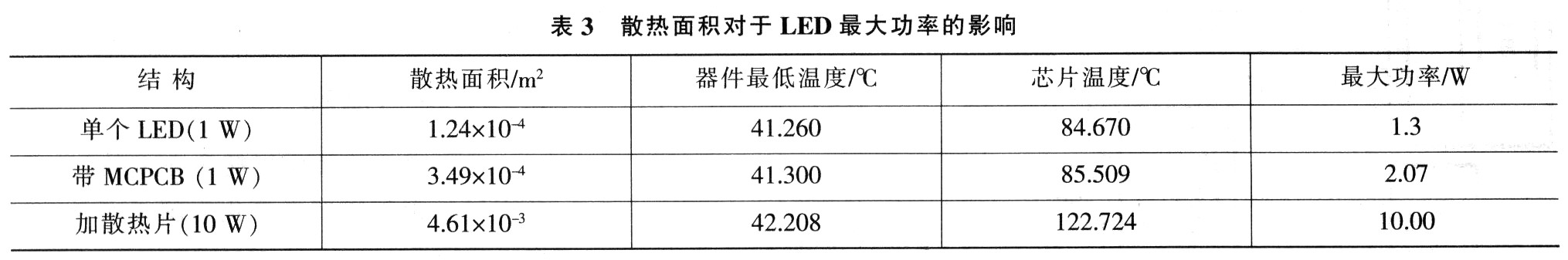表3为3种不同散热方式对LED的温度分布、最大功率的影响。可以看出,增加散热面积是很好的散热方式,可以轻易地提高LED器件散热能力,这是目前LED产品所普遍使用的散热方式之一。然而缺点也很明显:影响成本、增加产品重量、影响封装密度。无限度地提高LED散热片面积显然不现实,因此一般使用1.5inch2散热片提升LED产品最大功率至10 W左右,出于成本等因素就不能继续提高。