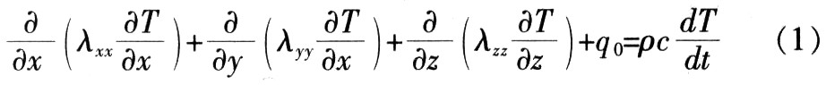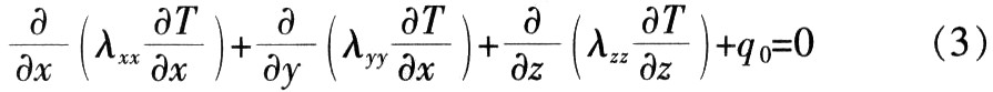 式中:T/x,T/y,T/z为沿x,y,z方向的温度梯度;λxx,λyy,λzz为热导率;q0为单位体积的热生成;ρc是密度与比热容的乘积:dT/dt为温度随时间的变化率。