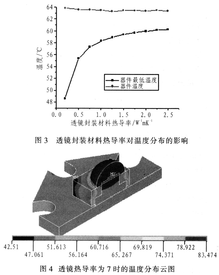 只考虑热传导与对流,改变不同封装填充材料如硅树脂.得出结果,如图3所示。即使找到一种热导率高达7 Wm-1K-1的环氧树脂成分封装材料时,相比使用热导率为0.25 Wm-1K-1的环氧树脂成分封装材料时,芯片温度下降不多,铝基板温度只下降了2.271℃,最大功率仅提高了0.69 W。实际上,热导率值超过7Wm-1K-1以上、可商业化的透明硅树脂封装材料目前尚无文献报导。分布云图如图4所示。