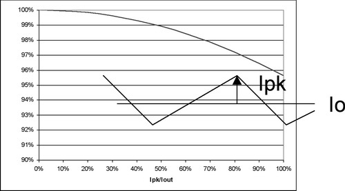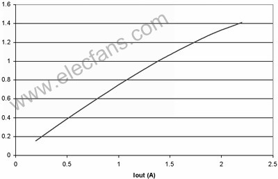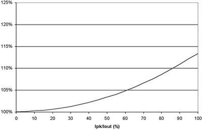 图4也阐明了即使在纹波电流较大的时候,对功耗也没有重大影响。例如,50%的纹波电流仅增加不足5%的功率损耗。当大大超过此水平时,需要减小电源的DC电流以保持结温不变,从而维持半导体的使用寿命。经验法则显示,结温每降低10%,半导体使用寿命就会延长两倍。并且,许多设计都倾向于更小的纹波电流,这是因为电感器的限制。绝大多数电感的设计处理能力小于20%的Ipk/Iout纹波电流比率。