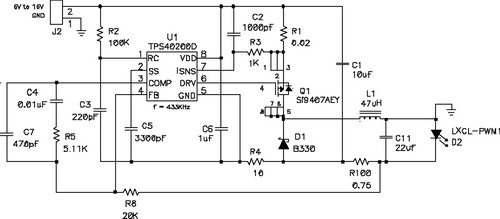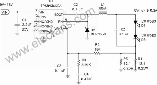 在输出电压始终小于输入电压的情况下,应使用降压稳压器,图5显示了该拓扑结构。在该电路中,对电源开关的占空比(dutyfactor)进行了控制,以在输出滤波器电感L1上确立平均电压。当FET开关闭合时(TPS5430内部),其将输入电压连接到电感器,并在L1中构建电流。D2为环流二极管(catchdiode),可提供开关断开时的电流路径。电感器可对流过LED的电流起到平滑的作用,该工作可通过用电阻监控(测量)LED电流,并将电压与控制芯片内部的参考电压进行比较,最终进行调节。如果电流太低,则占空比增加,平均电压也上升,从而也导致了电流的升高。该电路具有极佳的效率,因为电源开关、环流二极管以及电流感测电阻上的压降非常低。