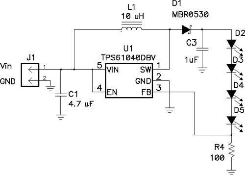 当输出电压总是比输入电压大时,最好采用升压转换电路,如图6所示。该电路的U1有一个带有控制电子器件的高度集成的电源开关。当开关闭合时,电流流过电感器到接地。当开关断开时,U1的引脚1电压会升高,直到D1导通。然后电感器放电,电流进入输出电容器(C3)和LED串。在绝大多数应用中,C3通常用于平滑LED电流。如果没有C3,则LED电流将是断断续续的。也就是说,它会在零和电感电流之间切换,这会导致LED热量增加(从而缩短使用寿命),亮度减少。在前面的例子中,LED的电流是通过一个电阻感测的,并且占空比会发生相应的变化。请注意,本拓扑存在一个严重的问题,即它没有短路保护电路。若输出短路,则会有较大的电流通过电感器和二极管,从而导致电路失效,或者输入电压崩溃。
