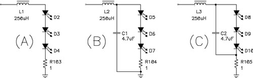 关闭LED电源上的电流环路比关闭传统电源上的电压环路简单。环路的复杂性取决于输出滤波器的配置。图8显示了三种可能的配置:只有一个简单电感器的滤波器(A);一个典型的电源滤波器(B);以及一个修正后的滤波器(C)。
