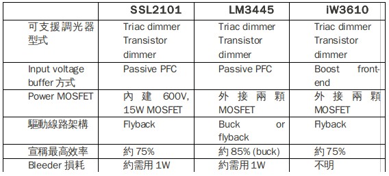 表二、 市面上可见的Triac Dimmable LED Lighting Driver IC