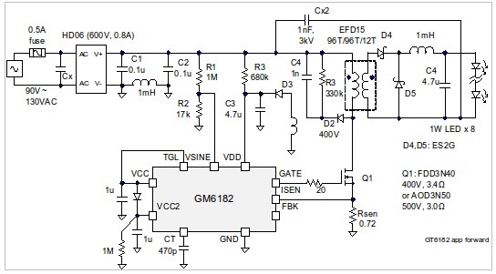 图一 GM6182 高功因、高效率、具有EZ Dimming 功能的LED 驱动器