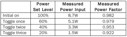 EZ dimming侦测wall switch切换次数,来改变调光准位。自全亮开始,循序降到六分亮,四分亮,二分亮。并且在任何调光阶段,都维持高于0.90的功因、高于80%的效率。切换柔和,完全没有突波电流或噪音的现象。线路精简,几乎是零增加硬体成本。