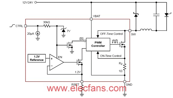 三种基本的驱动器 / 稳压器拓扑结构分别是降压、升压、降压 - 升压 ( 又称为单端初级电感转换,简称 SEPIC) 。在降压电路中,最低输入电压 (Vin) 在所有工作条件下永远高于 LED 串的最大电压,而在最大输入电压始终低于 LED 串最小电压时使用升压电路。由于恒流驱动器的升压拓扑结构属性,它要求额外的电路,用于 LED 开路及输出短路保护。图 1 显示了典型的 LED 降压配置。注意跟传统降压架构不同,这配置中开关接地参考, LED 串是浮接 (floating) 的。这拓扑结构基于专利的临界导电模式 ( CrM ) 降压架构,即使没有直接感测到流过 LED 串的电流,也会对 LED 平均电流进行稳流。