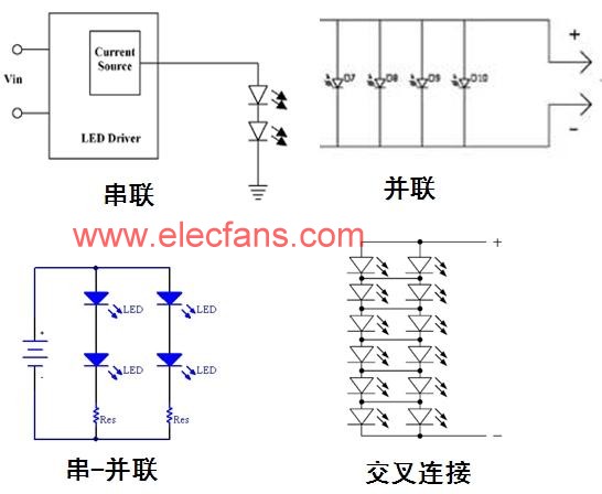 另外,应用中通常会使用多颗LED,这就涉及到多颗LED的排列方式问题。各种排列方式中,首选驱动串联的单串LED,因为这种方式不论正向电压如何变化、输出电压(Vout)如何“漂移”,均提供极佳的电流匹配性能。当然,用户也可以采用并联、串联-并联组合及交叉连接等其它排列方式,用于需要“相互匹配的”LED正向电压的应用,并获得其它优势。如在交叉连接中,如果其中某个LED因故障开路,电路中仅有1个LED的驱动电流会加倍,从而尽量减少对整个电路的影响。