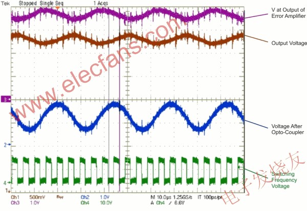 经过一段长时间的努力,发现虽然二次侧的错误放大器确实重现了出现在转换器输出端的涟波,并具有正确的180度相位变化,但来自光耦合器的信号却比频率约为35 kHz的预期相位偏移了大约45度。这足以移除交越的相位容限(phase margin),而导致所观测到的振荡。图1显示这三个波形。