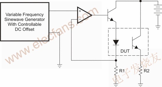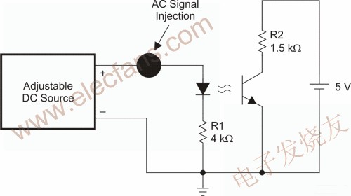 如果设计人员计划在频率超过8kHz且具有0dB交越的封闭反馈回路中使用光耦合器,必须先测试光耦合器,以了解其中的相位及增益特性。如果无法使用网络分析仪,可制作如图6所示的简易电路。这有助于设计人员以简易的元件、具DC偏移功能的变频信号产生器及电源供应器来辨识相位及增益。