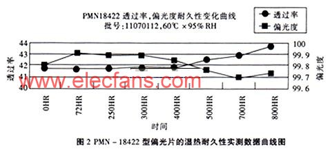 ??偏光片的耐久性技术指标包括耐高温、耐湿热、耐低温和耐冷热冲击四项技术指标,其中最重要的是耐湿热性能指标的高低。耐高温是指偏光片在恒定烘烤温度下的耐温工作条件,目前根据偏光片的技术等级,通常分为通用型:工作温度为70℃×500HR;中耐久型:工作温度为80℃×500HR;高耐久型:工作温度在90℃×500H以上这三个等级。耐湿热技术指标是指偏光片在恒温恒湿条件下的耐湿热工作性能,它也通常分为三个技术等级,既通用型:湿热工作条件为40℃×90%RH×500HR;中耐久型:湿热工作条件为60℃×90%RH×500HR;高耐久型:湿热工作条件为:70℃×95%RH×500HR以上。由于构成偏光膜的基本材料PVA膜和碘及碘化物都是极易水解的材料,同时也由于偏光片所使用的压敏胶在高温高湿条件下也容易劣化,因此,在偏光片的耐久性技术指标中最重要的就是耐高温和耐湿热指标,如果耐高温和耐湿热指标通过,其它耐久性型指标通常都不会发生问题。“福地”牌通用型PLN产品和中耐久PMN产品都能够很好地满足各自相应技术等级所规定的耐久性技术指标的要求(见图2)。?