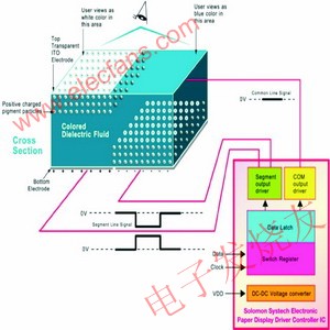 图中Positive Charged pigment particle——带正电的彩色颗粒。Top Transparent ITO Electrode——顶面透明的ITO电极,User View as White in this area——用户所见的这部分是白色的,User View as blue in thisarea——用户所见的这部分是蓝色的。Common line signal——共用线信号,Segment Line Signal——分段线信号,Bottom Electrode——底面电极,Segment Output driver——段输出驱动,COM Output driver——共用输出驱动,Data Latch——数据锁存器,Switch Register——交换寄存器,Voltage converter——电压变换器,Electronics paper display driver controller IC——电纸显示驱动控制器IC。