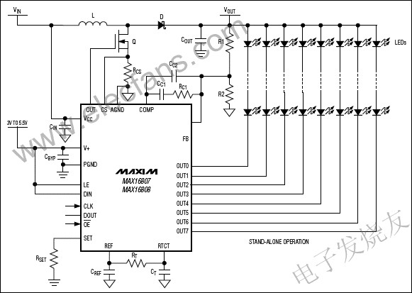 MAX16807可运行于独立工作模式,也可以由微控制器(µC)通过工业标准的4线串行接口控制。