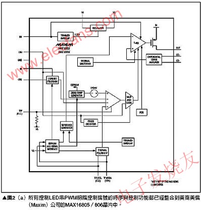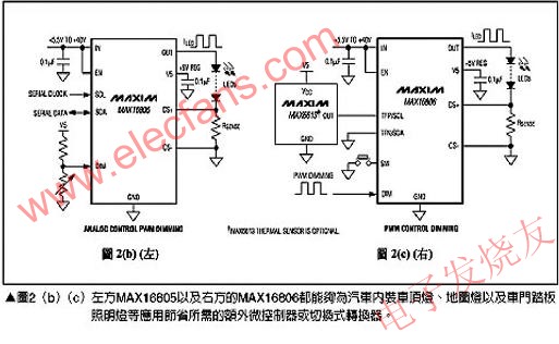 微控制器,对于这类应用就可以采用MAX16805以及MAX16806,请参考图2(a)、(b)与(c),这些