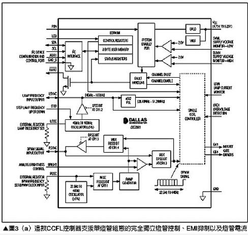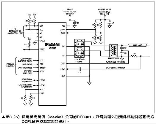 控制器在非汽车类应用中,例如液晶电视或液晶显示器上相当成功,但汽车的工作环境却对这项技术带来特殊的挑战与要求,为了让元件数减少,CCFL控制器必须包含包括如EMI抑制、灯管电流过度驱动(overdrive)能力,以及将接脚数降到最低的串行控制接口、各信道灯管失效监测、灯管频率与DPWM控制用精确内建振荡电路以及其它功能等,这类解决方案有美信(Maxim)公司的DS3881,请参考图3(a),其只需少许的外加电路,就能够组合出完整的CCFL电源控制子系统,请参考图3(b)。DS3881主要针对汽车应用环境进行最佳化设计,由于所采用的基础电路组态,因此外部