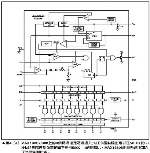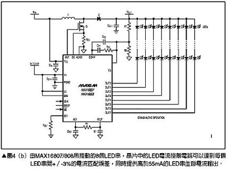 对于较小型的显示面板,就可以使用LED矩阵来取代CCFL背光,不过使用多个LED串也会带来相对的设计挑战,其中最明显的是如何能够在整个区域提供一致的照明与色彩输出。推动LED背光矩阵的一个方式是采用内含8个LED驱动通道,分别可以提供55mA电流输出的MAX16807与MAX16808,请参考图4(a),图4(b)则显示了采用MAX16807的典型电路如何简化系统,只需少数几个元件就能够完成背光驱动子系统的设计。