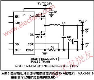 对于需要高照明功率,例如照明灯或雾灯等应用就必须使用多个高亮度LED(High BrightLED;HBLED),但是高亮度LED却需要超高驱动电流,要产生所需的电流会使用太多的驱动芯片,因此较简单的解决方案是使用可以推动高电流晶体管的控制器,为高亮度LED提供高达30A的电流,这类组件的一个范例为MAX16818,请参考图5。