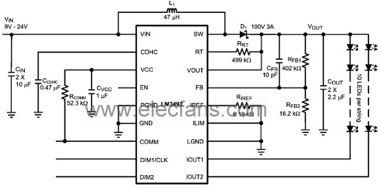 The LM3492 integrates a boost converter and a two-channel current regulator to implement a high efficient and cost effective LED driver for driving two individually dimmable LED strings with a maximum power of 15W and an output voltage of up to 65V. The boost converter employs a proprietary Projected- On-Time control method to give a fast transient response with no compensation required, and a nearly constant switching frequency programmable from 200 kHz to 1 MHz.