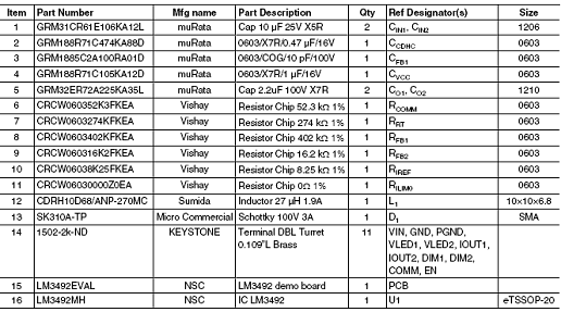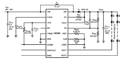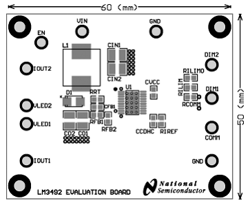 This application note details the design of a LM3492 evaluation board which drives 2 LED strings, each of which consists of 10 LEDs running at 150 mA and the forward voltage of each LED is typically 3.8V. The input voltage is from 9V to 16V. The evaluation board schematic, PCB layout, Bill of Materials, and circuit design descriptions are shown. Typical performance and operating waveforms are also provided for reference.