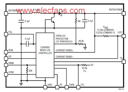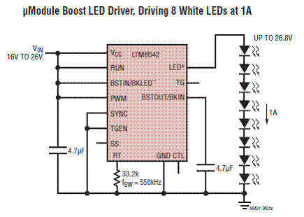 图6.LTM8042 驱动8个白光LED(1A)升压应用电路图