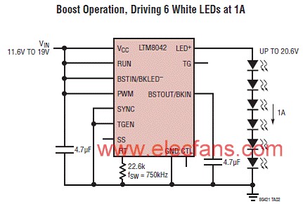 图2.LTM8042 驱动6个白光LED(1A)升压应用电路图