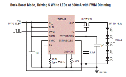 图3.LTM8042 驱动5个白光LED(500mA)带PWM调光的升降压模式应用电路图