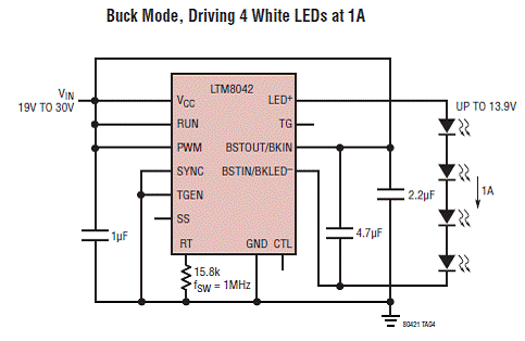 图4.LTM8042 驱动4个白光LED(1A)降压应用电路图