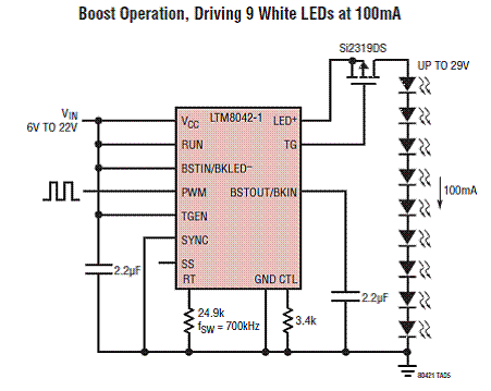 图5.LTM8042 驱动9个白光LED(100mA)升压应用电路图