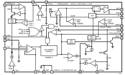 Additional features include: programmable maximum VOUT for open LED protection, a fault flag for open LED, programmable LED current derating vs temperature, micropower shutdown and internal soft-start. The LT3760 is available in a thermally enhanced 28-pin TSSOP Package.