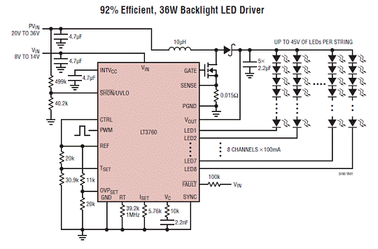 The LTR3760 is an 8-channel LED driver with a step-up DC/DC controller capable of driving up to 45V of LEDs.