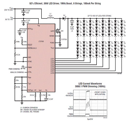 图3.效率92% 36W LED驱动器:1MHz升压,8串LED,每串100mA