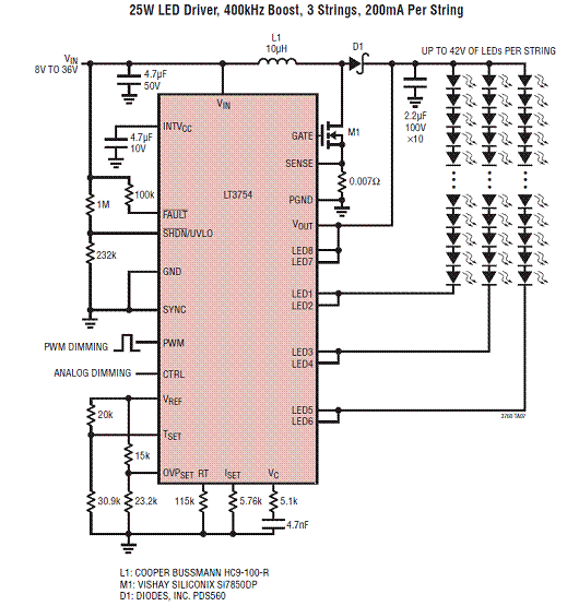 图7. 25W LED驱动器:400kHz升压,3串LED,每串200mA