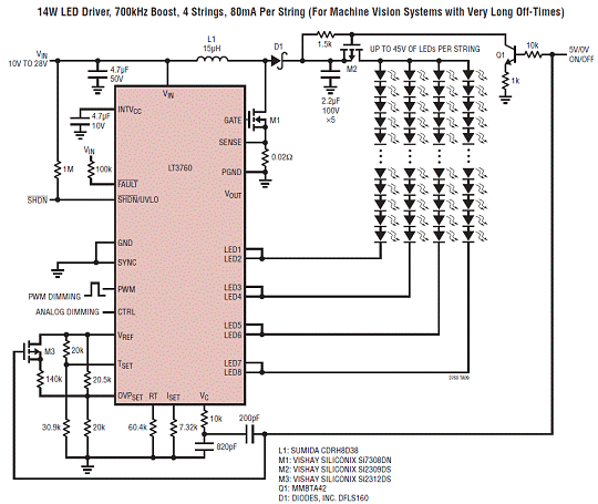 图9. 14W LED驱动器:700kHz升压,4串LED,每串80mA