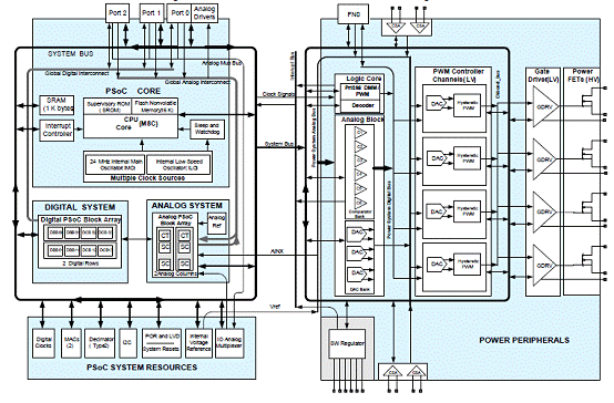 The PowerPSoC architecture, as illustrated in the block diagrams, comprises five main areas: PSoC core, digital system, analog system, system resources, and power peripherals which include power FETs, hysteretic controllers, current sense amplifiers,and PrISM/PWM modulators. Configurable global busing combines all the device resources into a complete custom system. The PowerPSoC family of devices have 10-port I/Os that connect to the global digital and analog interconnects, providing access to eight digital blocks and six analog blocks.