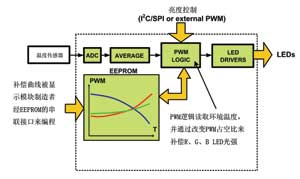 使用RGB背光时,当LED温度改变时,驱动器必须更正红、绿和蓝三主色间的亮度平衡,以防出现白点位移。此外,还需保证驱动器在任何操作温度下维持光的正确强度。而在补偿方面,可以用闭环或开环形式。若使用闭环补偿,便需采用感光器来测量白点和其强度。相反地,如使用开环补偿,那温度便需事先量度出来,并通过预先定义好的补偿曲线来调节亮度的平衡。